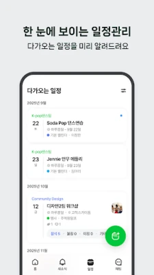 BAND는 모든 중요한 순간을 놓치지 않도록 세심하게 설계되었습니다. 새로운 게시물, 핵심 공지, 다가오는 이벤트 등 그룹 활동의 모든 흐름을 직관적인 알림으로 즉시 파악하고, 놓쳤던 정보는 홈 화면에서 한눈에 확인하세요. 더 이상 번거로운 조율 없이도, BAND의 공유 캘린더를 통해 모두가 함께 일정을 계획하고 중요한 기념일을 기념할 수 있습니다. 각자의 일상 속에 녹아들어 그룹의 목표와 추억을 함께 만들어가는 완벽한 도구입니다.