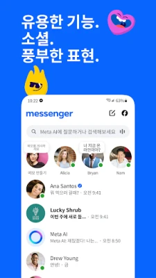Messenger는 언제 어디서든 사랑하는 사람들과 소통을 이어주는 무료 메시지 앱입니다. 가족 및 친구들과 쉽게 연결하고, 관심사를 공유하는 커뮤니티를 만들어 보세요. 단어뿐만 아니라 다양한 방법으로 자신을 자유롭게 표현할 수 있습니다.