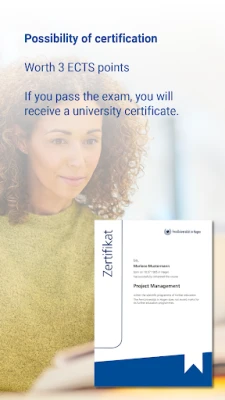 학습을 성공적으로 마친 후에는 온라인 또는 FernUniversität Hagen 캠퍼스 중 선택한 곳에서 필기시험에 응시할 수 있습니다. 시험 통과 시, 대학 인증의 공식 수료증을 받게 되며, 학생의 경우 기본 학위 취득을 위한 ECTS 학점도 인정받을 수 있습니다. FernUniversität Hagen의 CeW가 보증하는 이 전문 교육을 통해 당신의 커리어를 한 단계 업그레이드하세요.